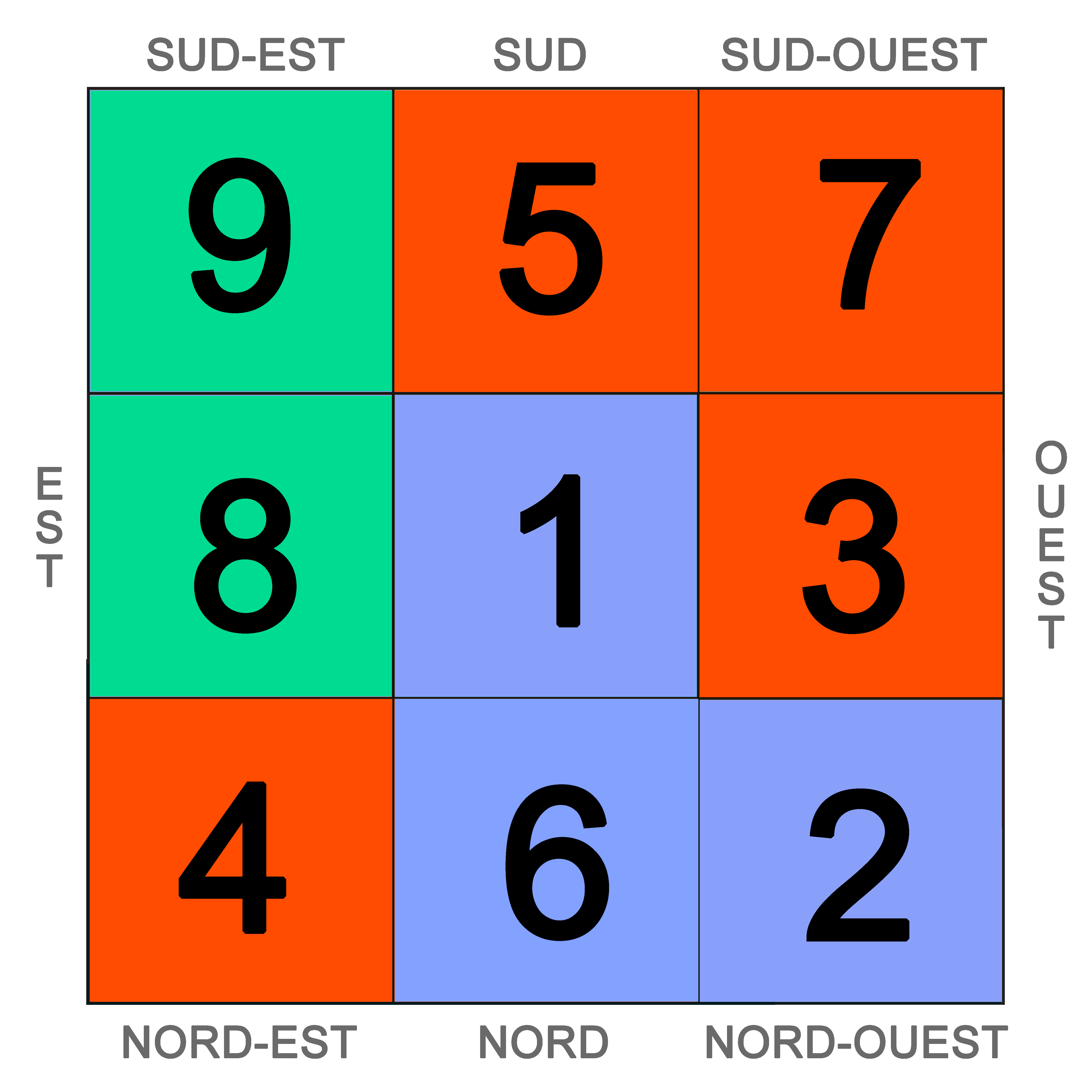 En combinant tous les aspects : les afflictions annuelles du Feng Shui, les Étoiles Volantes et le Qi Men Dun Jia de l’année du Cheval, nous obtenons le classement suivant, du meilleur au pire :
